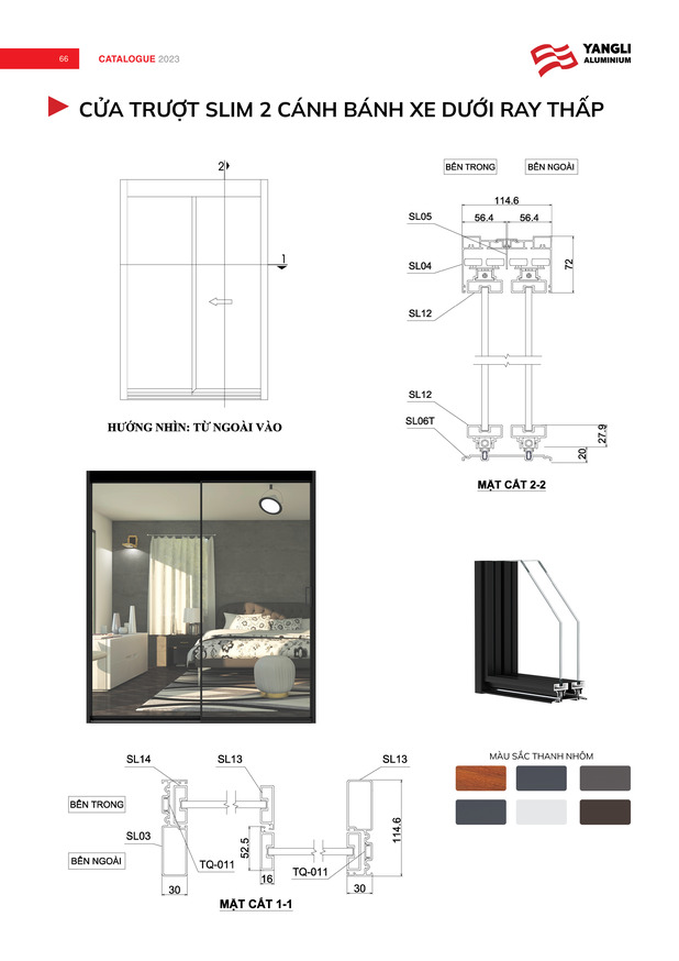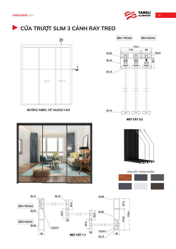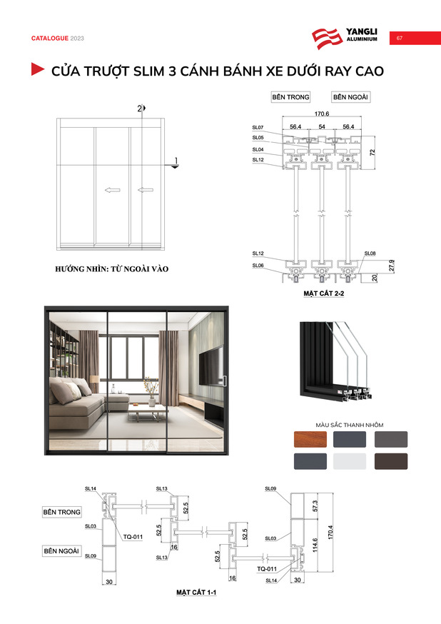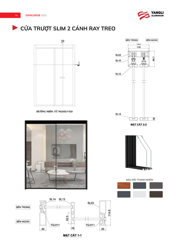 • Hệ phụ kiện đồng bộ cao cấp mang  tới khả năng vận hành bền bỉ, nhẹ nhàng, êm ái cho bộ cửa nhôm trượt slim.